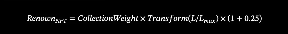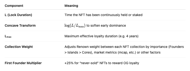 Each NFT tracks its own Renown Score, which represents its cumulative holding duration ("Lock Duration") and other variables. A player’s total Renown is the sum of all NFT-level scores in their account. Our implementation uses a formula that incorporates the following: