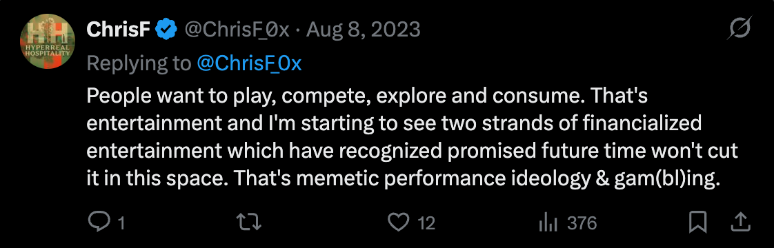 To understand the state of the current market, all you really need to know is that pretty much everything that's worked so far in consumer crypto (outside of stablecoins and other financial rails) has been some form of financialized entertainment - consumer products where the stakes / risk of (fake internet money) involved is a core part of the experience, creating some level of entertainment and social value.