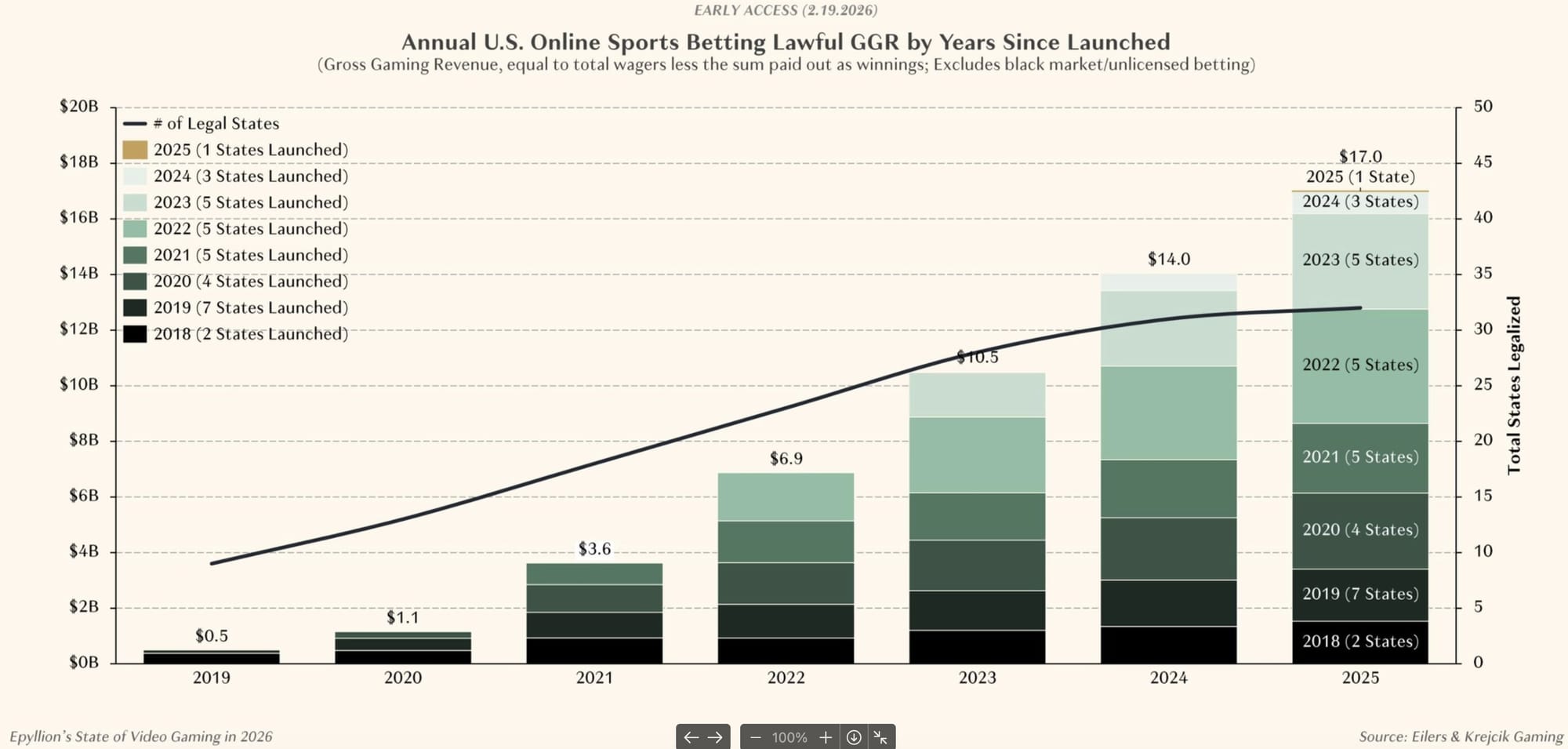 Traditional gaming is getting eaten. Since 2021, American spending on video games has DECREASED by total dollar figures. Over that same period, sports betting / casinos grew from $11.3B to $32.8B, and crypto / memes / prediction mkts / grew even more. When it comes to winning the war on attention, games and other forms of entertainment are starting to rapidly lose to activities w/ higher stakes. It's a fundamental consumer spend shift.
