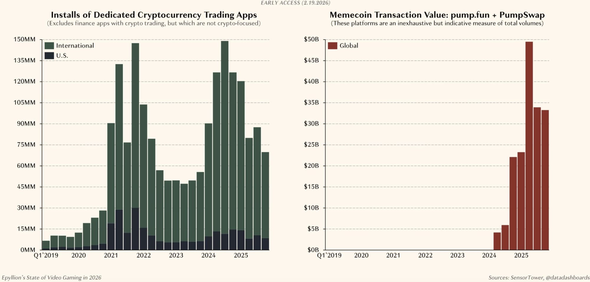 The rest of the current financialized entertainment category is not much better off atm, outside of prediction markets. There’s an incredible amount of retail exhaustion / burnout from trading. Perps, especially on alts, are the easiest way to get violated on chain by market makers and insiders who are structurally set up to never lose. Crypto trading is also cyclical and tied to macro, which makes for a poor business. Many words have already been written about the state of the trenches. There are real consequences to relentlessly exploiting all of the "fish" from your game. Eventually, they stop coming back.