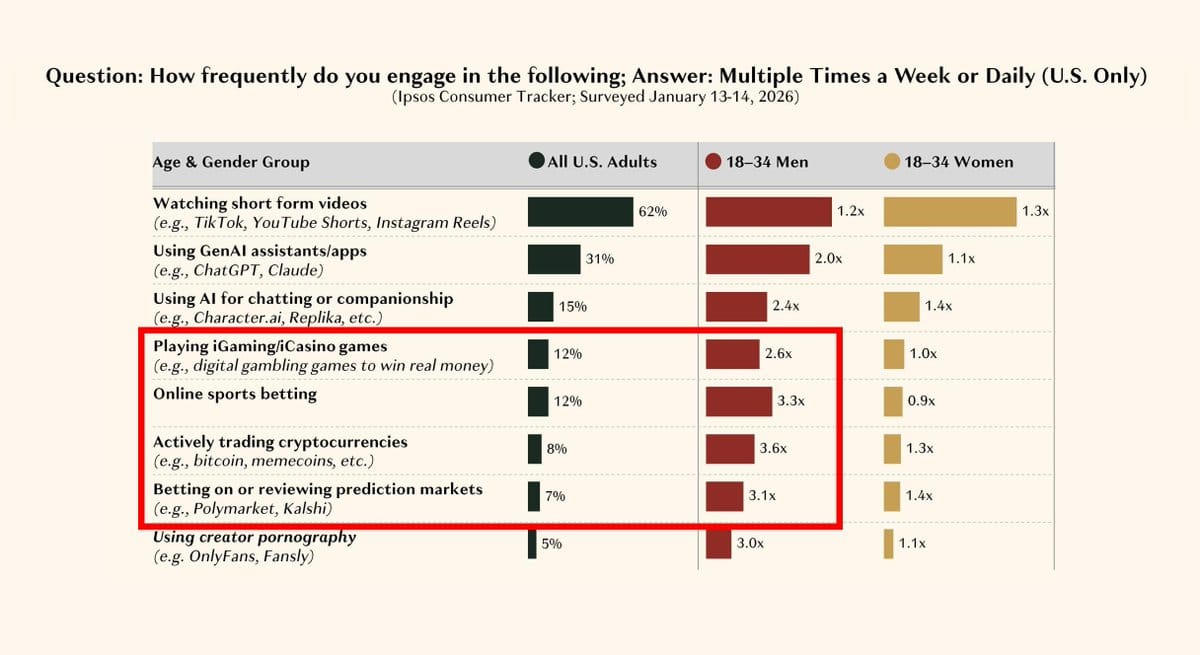 What's even crazier is that this growth looks like its just beginning, especially with younger generations. US Men 18-35 are 3.6x as likely as older generations to use prediction markets, trade crypto, sports bet, and iGame (real money games) - h/t @Epyllionco