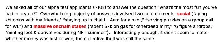 In these environments, those who take the biggest risks and survive gain the most status. This is why leaderboards in crypto products work so well. People want to create identities online, to be known and seen.In prehistoric times, cavemen always ran in tight knit packs for survival. They risked the life or death of the entire group daily, on small decisions like when to hunt, who to trust. The fact that someone new you met didn't stab you in the back for your gear while out on a hunt probably made you a friend for life. The environment created natural, deep connections.